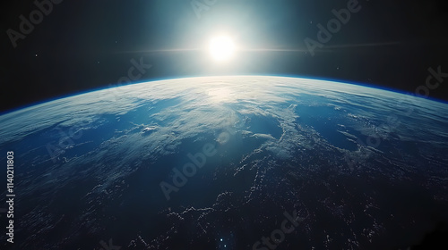 © Akharadat, Obraz premium In the sky, an airplane is flying over the earth.