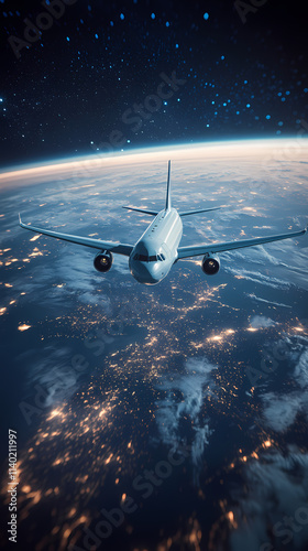 © Akharadat, Obraz premium In the sky, an airplane is flying over the earth.