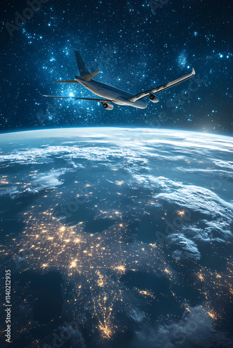Fototapeta premium In the sky, an airplane is flying over the earth.