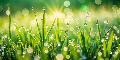 Fototapeta premium In the soft morning light, a vibrant green meadow sparkles with dew drops, radiating nature's pure beauty and freshness in a tranquil, inviting