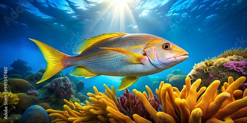 Naklejka premium In the softbox of coral, a yellowtail snapper's electric blue fins and...