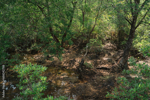 Fototapeta premium In the tropical forest, a mangrove tree spreads its root deep in the water, blending with the green landscape and showing the raw beauty of untouched nature.