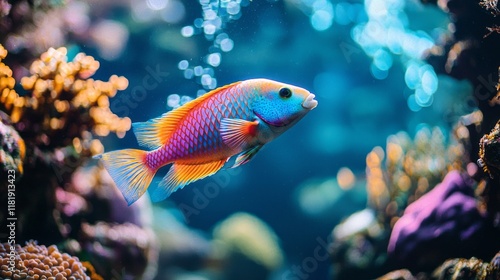 Fototapeta premium In the warm embrace of tropical waters, a lively parrotfish delicately nibbles on coral, showcasing its brilliant colors amidst the vibrant underwater landscape