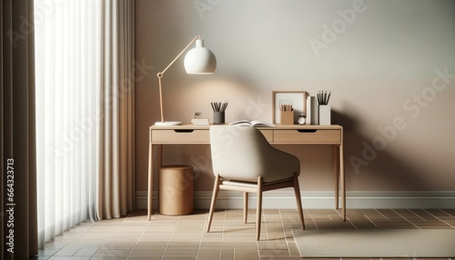 Fototapeta premium In the warm glow of a lamp, a solitary desk stands against the wall, its...