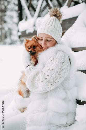 Obraz premium In the winter forest, a young blonde girl with long hair in a white sweater, white fur coat, white hat and white mittens smiles and holds a Spitz dog in her arms