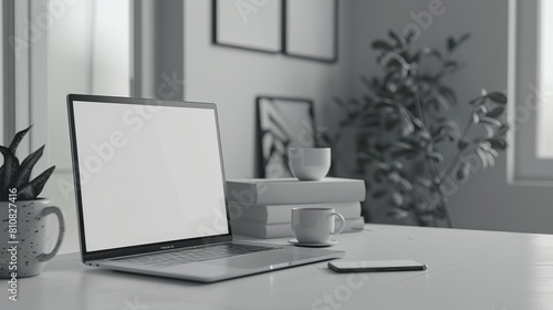 © Mahmud, Obraz premium In this close-up view, a modern white workspace is depicted, featuring a laptop with a blank screen mockup. Alongside the laptop, there's a book, a coffee cup, and decorative items neatly arranged