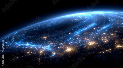 Fototapeta premium In this sci-fi scene, a sophisticated space station is orbiting a stunning blue planet that emits a bright glow