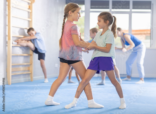 © JackF, Fototapeta premium In vibrant gym, young athletes train tirelessly, honing their skills with leg sweep techniques.