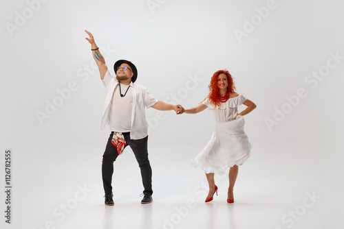 Naklejka premium In vibrant salsa training session, couple of dancers synchronize their movements against white studio background. In rhythm of love. Concept of dance class, hobby, art, dance school, talent