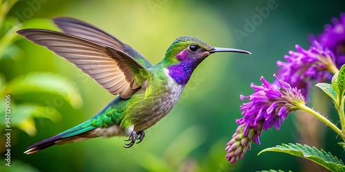 Fototapeta premium In warm sunlight, a whimsical hummingbird drinks nectar from a purple flower, its iridescent feathers shimmering, amidst lush green surroundings and ruffled tail feathers.
