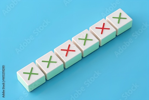 Obraz premium Inconsistency Check – Green and Red X Symbols on Sequential Cubes, Quality...