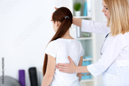 © Africa Studio, Obraz premium Incorrect posture concept. Physiotherapist examining and correcting girl's back