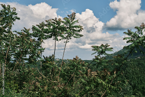 © Anastasiia, Obraz premium Incredible peaceful mountain landscape with fluffy curly clouds in the blue sky