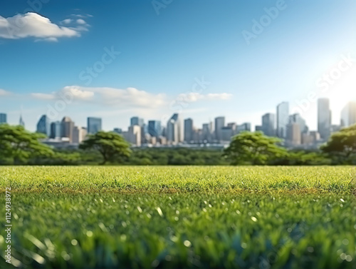 © Mst, Fototapeta premium Incredible Urban Park with Lush Grass and City Skyline on Sunny Day