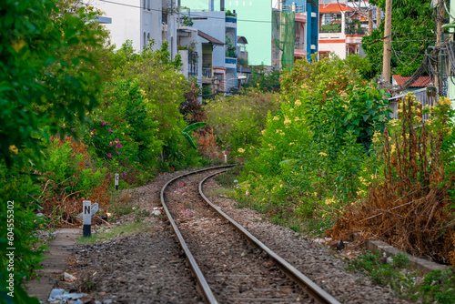 © Quang Ho, Naklejka premium Incredible view of train passing through a narrow street, the Hanoi Old Quarter. Stock photo