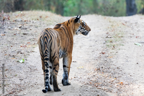 Fototapeta premium India, Madhya Pradesh, Kanha National Park. A female Bengal tiger walking down the road.