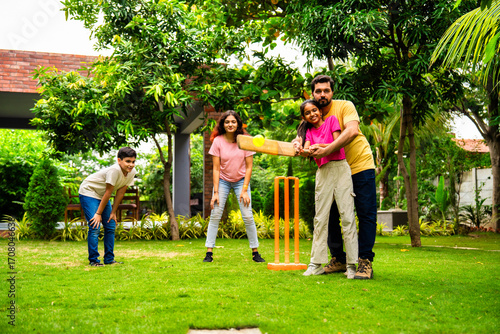 Fototapeta premium Indian Asian family bonding through outdoor cricket batting in garden,...