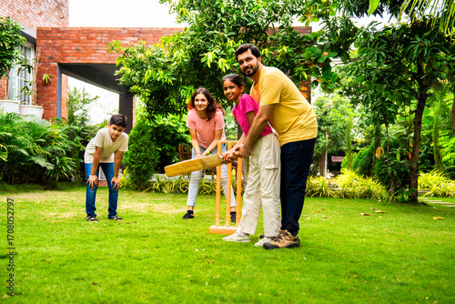 Fototapeta premium Indian Asian family bonding through outdoor cricket batting in garden,...