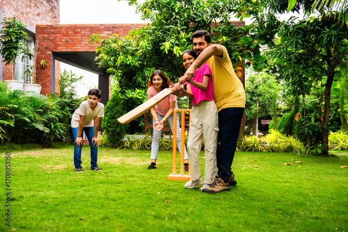Fototapeta premium Indian Asian family bonding through outdoor cricket batting in garden,...