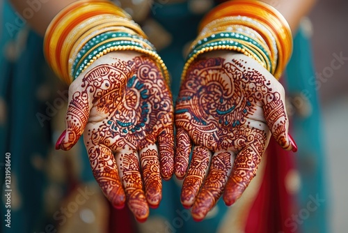 © Lubos Chlubny, Naklejka premium Indian bride showing henna tattoo on hands wearing traditional bracelets