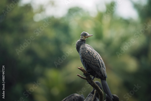 © Anurada, Obraz premium Indian Cormorant perched on a branch by the Mahaweli River in Sri Lanka