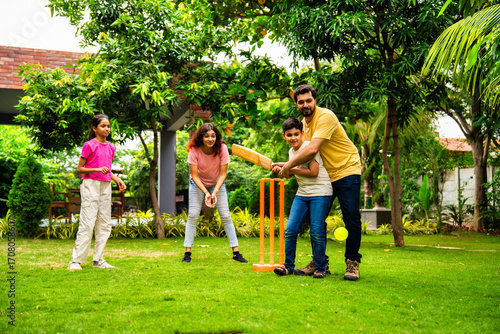 Obraz premium Indian family playing cricket batting joyfully in garden during outdoor...