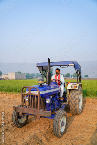 © Niks Ads, Fototapeta premium Indian farmer sitting on tractor at agriculture field.