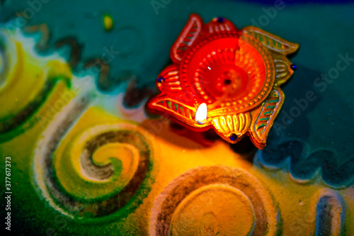 Fototapeta premium Indian Festival Diwali , lamp on colorful rangoli design