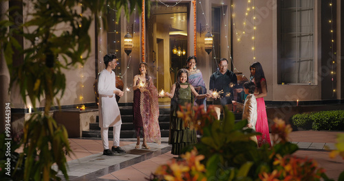 © Raushan_films, Obraz premium Indian Hindu Asian happy family teen girl boy child hold play crackers make fun joy night decor light diya home young adult male man female wife lady multi group older elder mom dad enjoy Diwali house