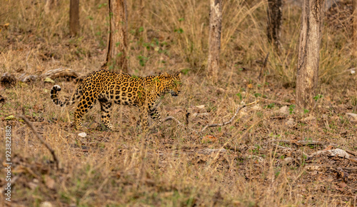 Obraz premium Indian Leopard Standing Looking at Prey, Tadoba National Park, India