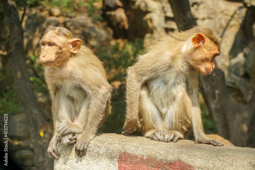 © 35mm, Fototapeta premium Indian macaque sitting on cement block