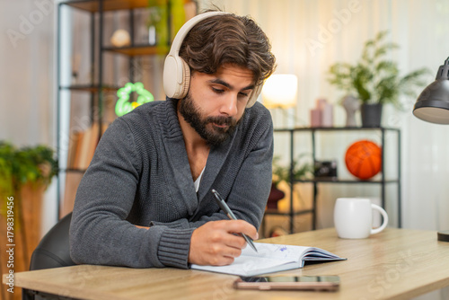 Fototapeta premium Indian man at home listens to audiobook with headphones takes notes in notebook stays focused. Arabian guy at desk writes key ideas marks quotes learns skills keeps attention and reviews notes after