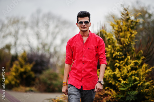 © AS Photo Family, Obraz premium Indian man at red shirt and sunglasses posed outdoor.