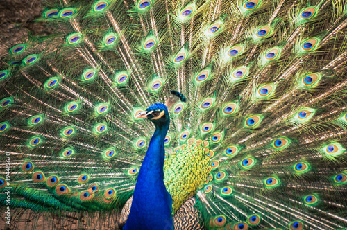 Naklejka premium Indian Peacock dancing, focused on beautiful feathers