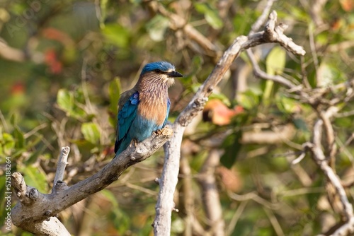 Fototapeta premium Indian roller, Blue jay perched on a branch tree stump,