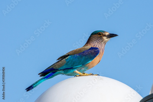 Fototapeta premium Indian roller (Coracias benghalensis) stands on on pole with bright blue sky in the Middle East