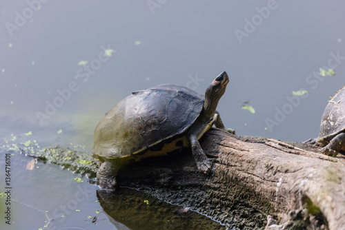 Fototapeta premium Indian roofed turtle (Pangshura tecta) taking sunbath on tree near green...