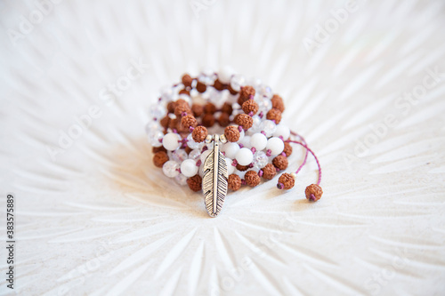 © marbenzu, Fototapeta premium Indian seed and white jade beads mala necklace on white background