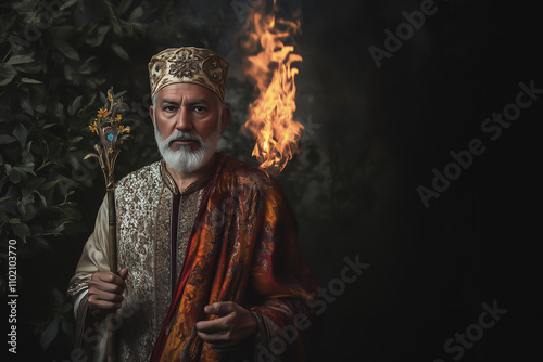 © OneLoveOnePhoto, Naklejka premium Indian shaman with a staff and fire in nature.