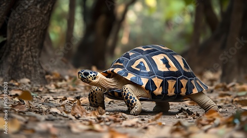 © Ariep, Obraz premium Indian Star Tortoise Walking Through Forest