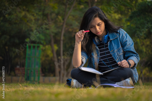 Obraz premium Indian student at college campus full size image reading books and watching...