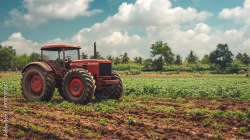 © atipong, Fototapeta premium Indian tractor standing in the middle of a farm field