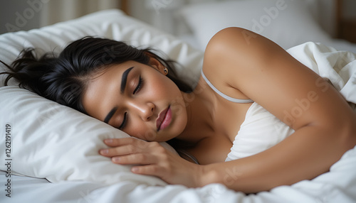 Fototapeta premium Indian woman sleeping well with soft white pillow and fresh bedding.
