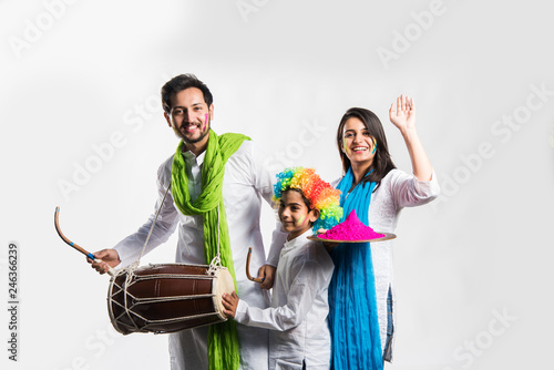 Fototapeta premium Indian young couple with kid celebrating holi festival. Dancing and playing drums and holding plate full of colours