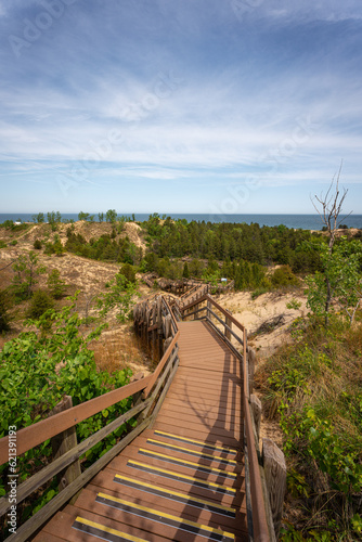 © Anthony, Fototapeta premium Indiana Dunes National Park with foot path, trees and Lake Michigan