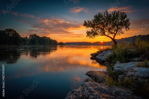 © Vlad, Obraz premium Indiana River Sunrise: Tranquil Waterscape with Silhouetted Trees and Orange Sky