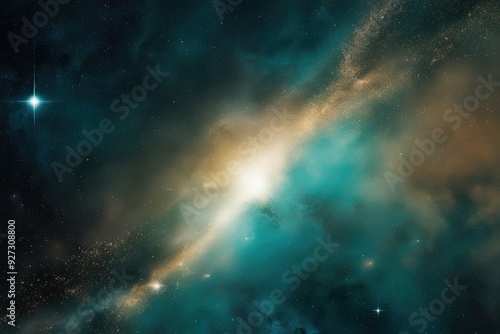 © Michael, Fototapeta premium Indigo Teal and Gold Cosmic Starfield Gradient Background with Luminous Textures and Expansive Horizons