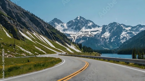 © Free, Fototapeta premium inding paved road leads towards a mountain range with snow-capped