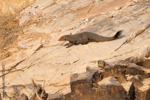 © Maria, Obraz premium Indische Rotmanguste läuft über einen Felsen