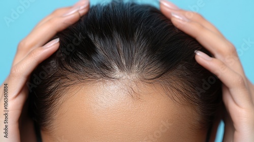Naklejka premium Individual with receding hairline holds back thinning hair in a close-up shot...